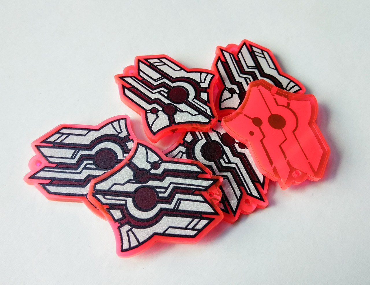 1" charm with single-side printing on UV reactive orange acrylic. Comes on a phone strap by default.